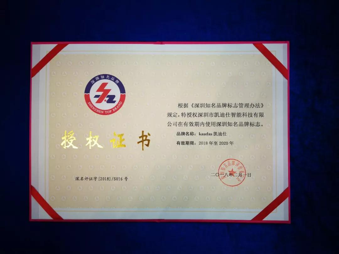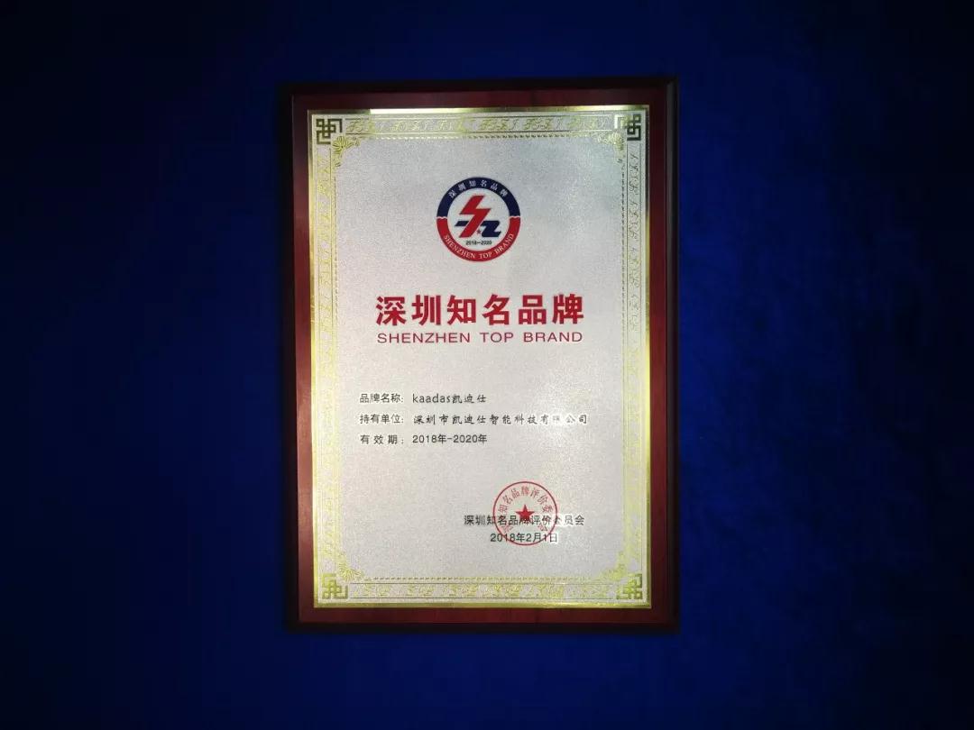 2018年(nian)5月9日(ri),第二屆深圳國(guo)際(ji)品(pin)牌周暨中(zhong)國(guo)品(pin)牌日(ri)•深圳站開幕大(da)會于(yu)深圳廣(guang)電(dian)集(ji)團(tuán)演播大(da)廳隆重(zhong)舉行,同期舉行第十五屆深圳知名(míng)品(pin)牌成(cheng)果髮(fa)布會。會上,Kaadas凱迪仕榮獲“深圳知名(míng)品(pin)牌”稱号并被授(shou)予獎章。