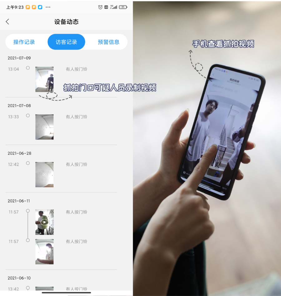 ✔ “有(yǒu)心人(ren)”們(men)口長(zhang)時間逗留,自動(dòng)觸髮(fa)徘徊報警,可(kě)視貓眼抓拍們(men)口來人(ren)視頻,推送報警信(xin)息給手機(jī),查看抓拍視頻,及(ji)時處理(li)異常情況。